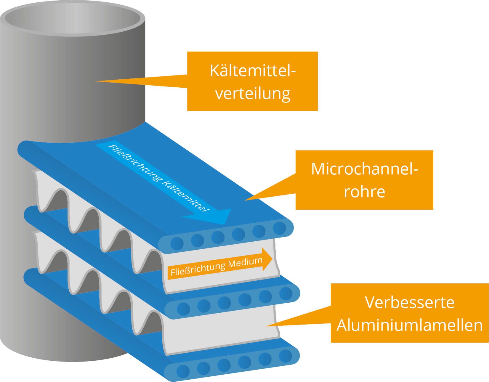 Die große Anzahl kleiner μ-Kanäle (blau dargestellt) bietet eine wesentlich größere wärmeaustauschende Oberfläche als herkömmliche Verdampfer. Die Sinuswellen/Lamellen (hellgrauer Bereich), welche die Emulsion bzw. das Öl im Durchlauf temperieren, werden deutlich schneller abgekühlt. Der Verdampfungsprozess ist dadurch effizienter. Der geringe Durchmesser der Kapillare benötigt zudem deutlich weniger Kältemittel. Das 2-Pass-System der Kältemittelverteilung erzielt von Anfang an eine gleichmäßige Kältemittelgasgeschwindigkeit ohne Beeinträchtigung der Gasdrücke, was eine weitere Effizienzsteigerung bedeutet. Die Beschichtung des Microchannels biete zudem einen erhöhten Schutz gegen Korrosion und chemische Einflüsse.